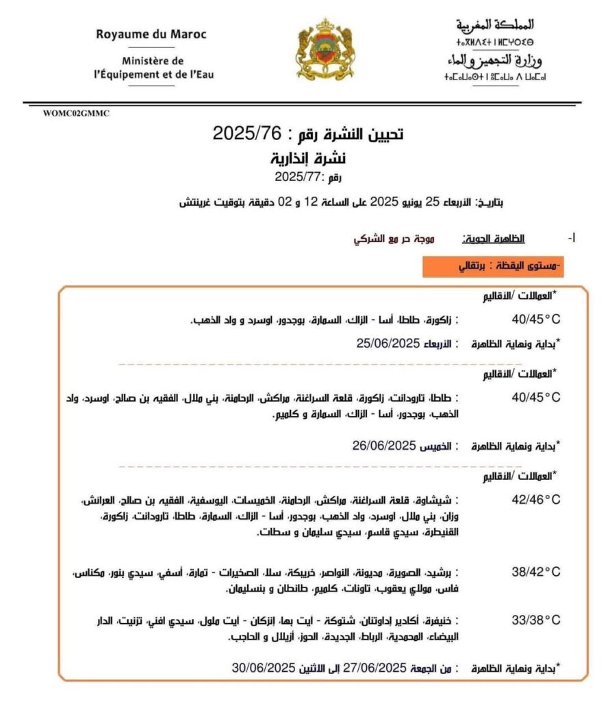 الرباط – أعلنت المديرية العامة للأرصاد الجوية، اليوم الأربعاء 25 يونيو 2025، عن نشرة إنذارية من مستوى اليقظة البرتقالي، تحذر فيها من ارتفاع شديد في درجات الحرارة سيشمل عددا من أقاليم المملكة، وفي مقدمتها إقليم السمارة.ووفقا للنشرة رقم 76/2025 المحينة، من المرتقب أن تتراوح درجات الحرارة القصوى بين 40 و45 درجة مئوية بإقليمي السمارة والزاك، إلى جانب زاكورة، طاطا، أسا، بوجدور، أوسرد وواد الذهب، وذلك ابتداءً من يوم الأربعاء 25 يونيو إلى غاية الاثنين 30 يونيو 2025.وستبلغ درجات الحرارة ذروتها يومي الخميس والجمعة، حيث يُنتظر أن تسجل ما بين 42 و46 درجة في مناطق متعددة، تشمل أيضًا قاعة السرااغنة، الرحامنة، بني ملال، الفقيه بن صالح، تارودانت وأكادير.وتدعو جريدة صوت السمارة الساكنة المحلية إلى اتخاذ الحيطة والحذر، خاصة الفئات الهشة كالمسنين والأطفال، والإكثار من شرب المياه وتفادي التعرض المباشر لأشعة الشمس خلال فترة الذروة، إلى حين تجاوز هذه الموجة الحرارية.