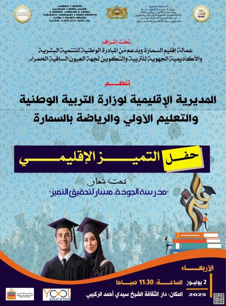 في إطار ترسيخ ثقافة الاعتراف بالجهد والاجتهاد، واستحضارا لقيم التميز في المسار التعليمي، تستعد المديرية الإقليمية لوزارة التربية الوطنية والتعليم الأولي والرياضة بالسمارة، لتنظيم حفل التميز الإقليمي يوم الأربعاء 2 يوليوز 2025 ابتداء من الساعة 11:30 صباحا وذلك بـدار الثقافة الشيخ سيدي أحمد الركيبي.
