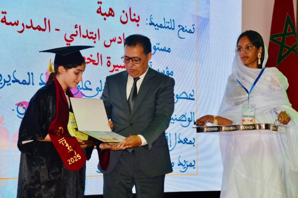 في لحظة احتفاء مستحقة بالتفوق والاجتهاد، احتضنت مكتبة محمد السادس الوسائطية بمدينة العيون مساء يوم الإثنين 30 يونيو 2025، فعاليات حفل التميز السنوي، الذي خصص لتكريم التلميذات والتلاميذ المتفوقين في مختلف الامتحانات الإشهادية برسم الموسم الدراسي 2024/2025، والمنتمين للمديرية الإقليمية للعيون.وقد ترأس مراسيم هذا الحفل التربوي الرفيع السيد والي جهة العيون الساقية الحمراء، مرفوقا بوفد رسمي هام بحضور السيد مدير الأكاديمية الجهوية للتربية والتكوين، إلى جانب المديرة الإقليمية لمديرية طرفاية، والمدير الإقليمي المكلف بتدبير شؤون مديرية العيون، ورؤساء الأقسام والمصالح، وعدد من مديرات ومديري المؤسسات التعليمية، والأطر التربوية والإدارية، وممثلي جمعيات أمهات وآباء وأولياء التلاميذ، فضلا عن فعاليات إعلامية وطنية وجهوية.وقد استهل الحفل بتلاوة آيات بينات من الذكر الحكيم، تلتها لحظة الإستماع إلى النشيد الوطني، قبل أن يتفضل السيد المدير الإقليمي بكلمة عبر من خلالها عن بالغ شكره وامتنانه للسيد الوالي على رعايته المتواصلة لمحطات التميز ودعمه اللامشروط للمدرسة العمومية، كما نوه بمجهودات كافة الفاعلين في الحقل التربوي، من أطر إدارية وتربوية، وشركاء ومجالس منتخبة وأسر التلاميذ.وتخللت الحفل لوحات فنية معبرة، أبدع في تقديمها تلامذة المؤسسات التعليمية، عكست التنوع الثقافي للمملكة المغربية، وقد أضفت على أجواء الحفل طابعا احتفاليا بهيجا.وقد كان التتويج لحظة مؤثرة بامتياز، حيث تم تكريم المتفوقين الأوائل على صعيد الجهة، في مقدمتهم التلميذ يحيى محمدي والتلميذة أسماء الغشولي، اللذين حصلا على أعلى معدل في الامتحان الوطني، إضافة إلى تتويج متفوق من ذوي الهمم، وآخر من نزلاء السجن المحلي بالعيون، في إشارة قوية إلى أن التفوق لا يعرف حدودا ولا قيودا.واختتم الحفل بقراءة برقية الولاء والإخلاص المرفوعة إلى حضرة صاحب الجلالة الملك محمد السادس نصره الله وأيده، عربون وفاء وارتباط بالعرش العلوي المجيد.ويأتي تنظيم هذا الحفل السنوي كتقليد راسخ لتشجيع ثقافة التميز في صفوف المتعلمين والمتعلمات، واعترافا بالجهود الجبارة التي بذلتها الأسر والأطر التربوية والإدارية، وجميع المتدخلين في الشأن التعليمي، محليا وجهويا.وبهذه المناسبة تجدد المديرية الإقليمية للعيون شكرها الخالص للسيد والي جهة العيون الساقية الحمراء، ولجميع الشركاء، من مجالس منتخبة ومصالح خارجية وأجهزة أمنية، ولكافة نساء ورجال التعليم، وجمعيات الآباء، ووسائل الإعلام، على انخراطهم البناء في تنزيل مشاريع خارطة الطريق 2022–2026، وعلى ما أبانوا عنه من التزام مشترك في سبيل الارتقاء بالمدرسة المغربية.