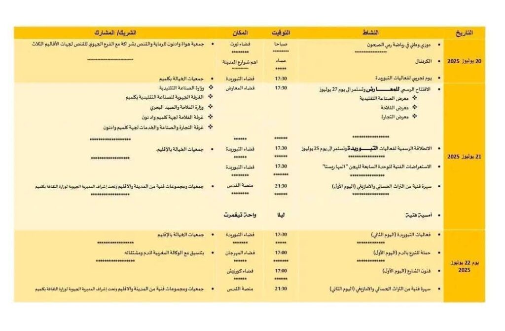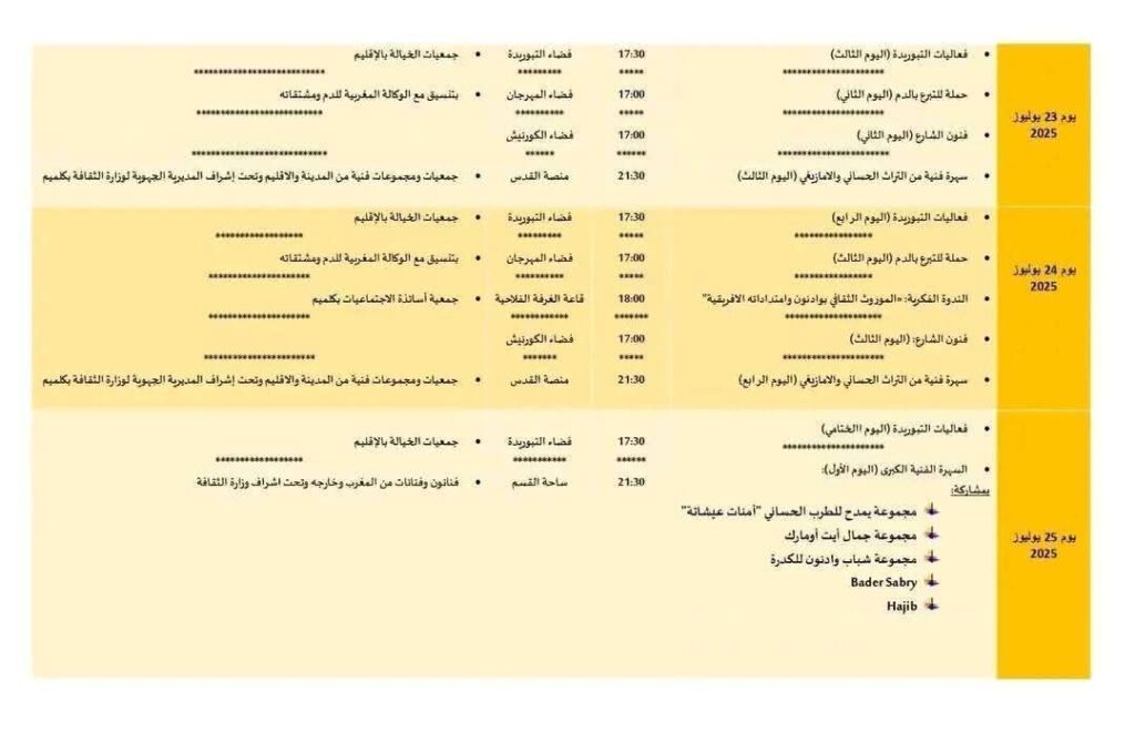 ويضم البرنامج العام للمهرجان فقرات متنوعة تشمل عروضا فنية وأمسيات شعرية وندوات فكرية، بالإضافة إلى مسابقات وفضاءات وعروض تسلط الضوء على المنتوجات المحلية والحرف التقليدية، في أفق تعزيز التنمية السياحية والاقتصادية بالجهة.
