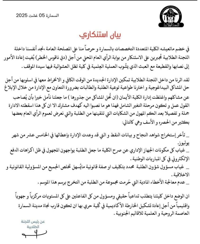 وختم البيان بالدعوة إلى إعادة تشكيل الخارطة الأكاديمية للكلية، معتبرا أنها يجب أن تكون “قارب نجاة لمدينة السمارة، العاصمة الروحية والعلمية للأقاليم الجنوبية”.
