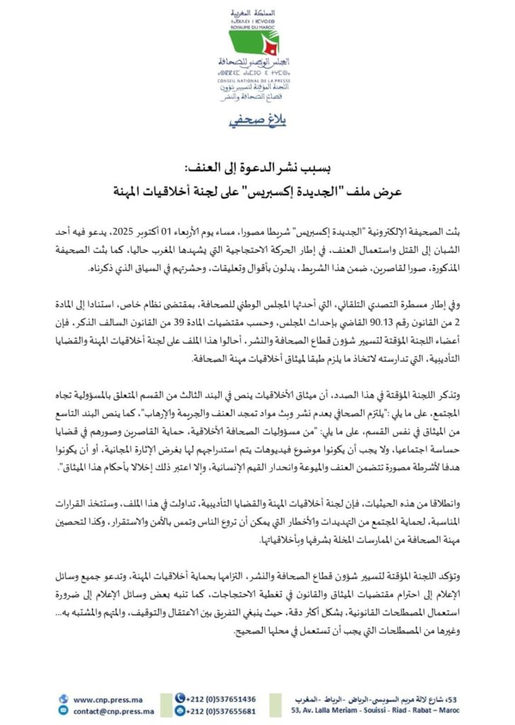 أعلن المجلس الوطني للصحافة في بلاغ رسمي، عن إحالة ملف إحدى المنابر الإعلامية على لجنة أخلاقيات المهنة، وذلك عقب بثها شريطا مصورا تضمن دعوة صريحة إلى القتل واستعمال العنف في سياق احتجاجات اجتماعية.