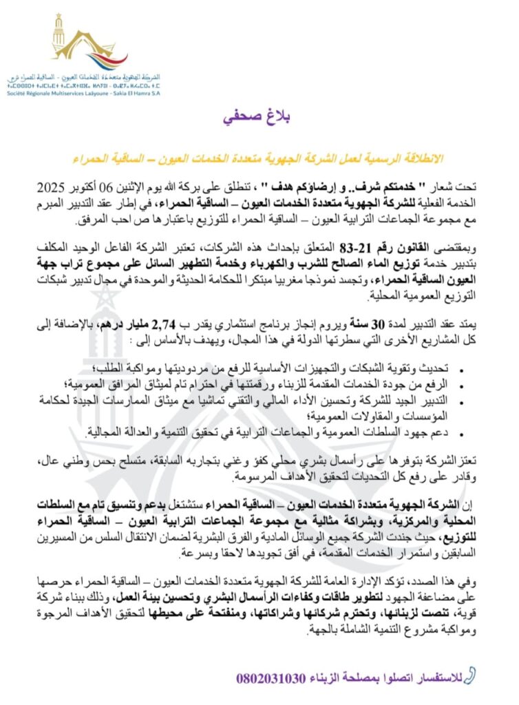 وأكد البلاغ أن الشركة الجهوية متعددة الخدمات العيون – الساقية الحمراء تشتغل بتنسيق وثيق مع السلطات المحلية والمركزية في أفق تحقيق انتقال سلس في تدبير المرافق الحيوية وضمان استمرارية الخدمات المقدمة للساكنة.