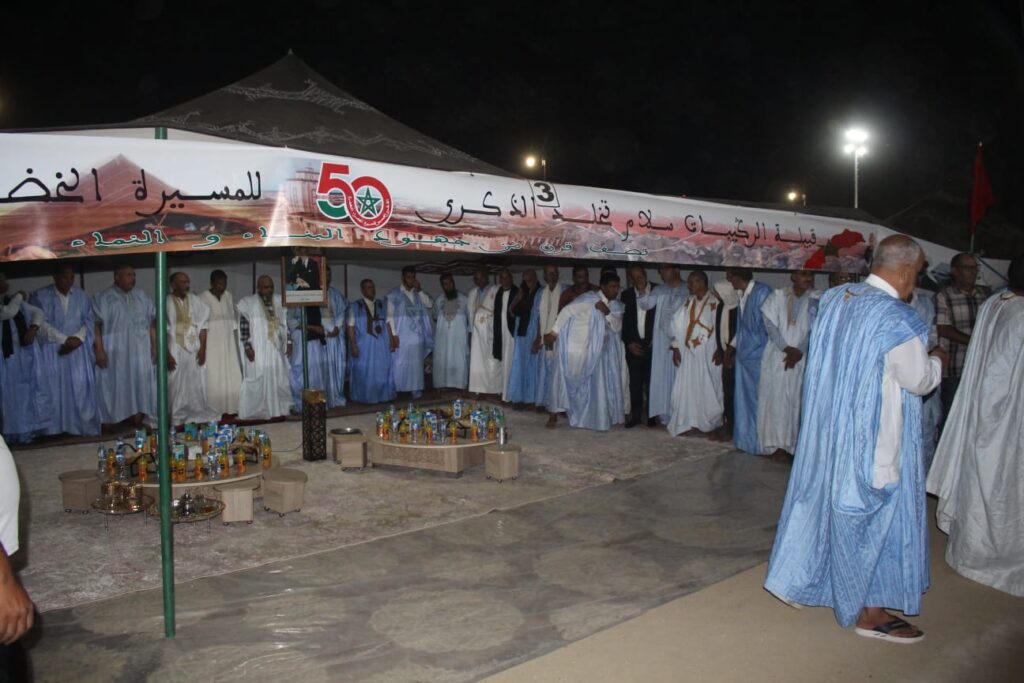 وقد تم خلال هذه الجولة الوقوف على الخمسين خيمة التي تم تشييدها بساحة المسيرة، والتي تجسد التنوع والغنى الثقافي للقبائل الصحراوية، وتعكس مظاهر الضيافة والكرم الصحراوي المتجذر في تاريخ الصحراء المغربية.