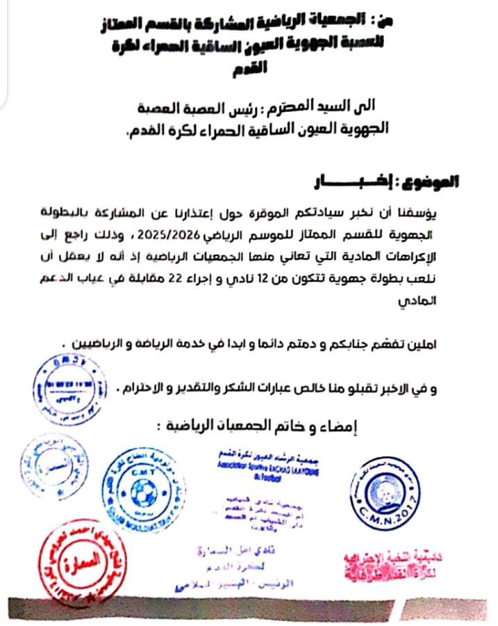قدمت الجمعيات الرياضية المنضوية تحت لواء العصبة الجهوية العيون الساقية الحمراء لكرة القدم والمشاركة في القسم الممتاز، اعتذارها الرسمي عن المشاركة في بطولة الموسم الرياضي 2025/2026.