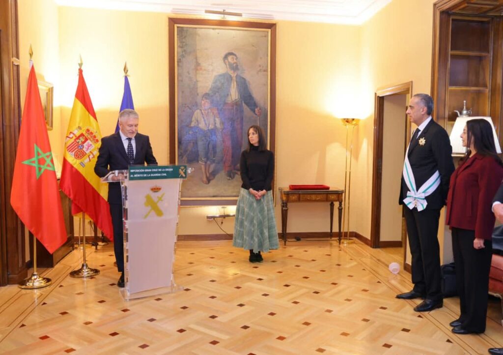 الرباط – أشرف وزير الداخلية الإسباني فرناندو غراندي مارلاسكا، اليوم الثلاثاء، بالعاصمة الإسبانية مدريد، على الحفل الرسمي لتوشيح المدير العام للأمن الوطني ولمراقبة التراب الوطني السيد عبد اللطيف حموشي بوسام الصليب الأكبر للاستحقاق للحرس المدني، الذي يعد أرفع وأسمى وسام تمنحه هذه المؤسسة الأمنية للشخصيات الأجنبية.