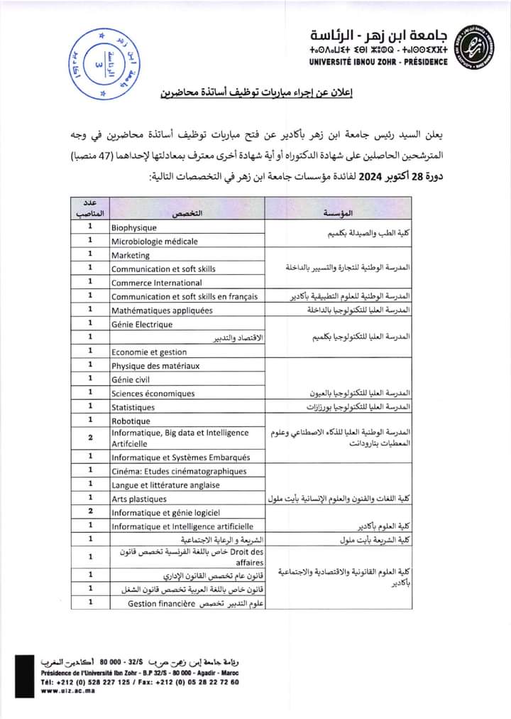 أعلن السيد رئيس جامعة ابن زهر بأكادير عن فتح باب الترشح لمباريات توظيف أساتذة محاضرين، والموجهة لحاملي شهادة الدكتوراه أو شهادات أخرى معترف بمعادلتها. سيتم التنافس على 47 منصبا في تخصصات مختلفة ضمن دورة 28 أكتوبر 2024، وستكون هذه المناصب مخصصة لفائدة مؤسسات جامعة ابن زهر ومن ضمنها منصب استاذ بالكلية المتعددة التخصصات بالسمارة.