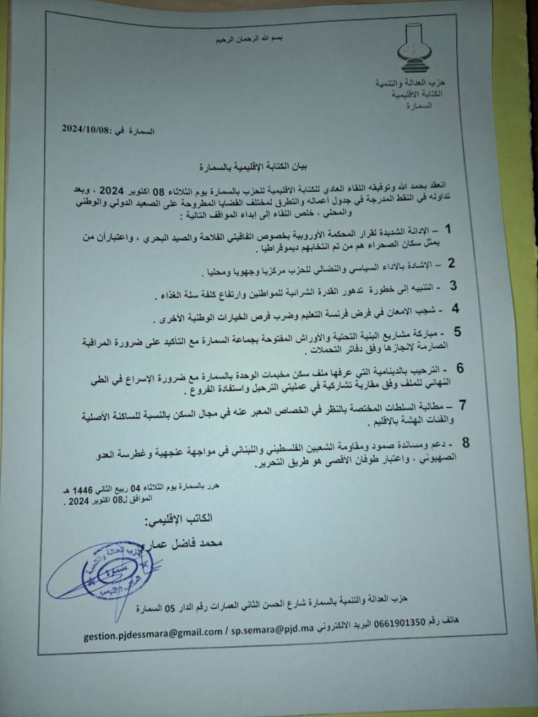 أصدرت الكتابة الإقليمية لحزب العدالة والتنمية بالسمارة بيانا يوم الثلاثاء 08 أكتوبر 2024 بعد انعقاد اجتماعها الدوري لمناقشة التطورات الوطنية والدولية وتأثيراتها على الصعيدين المحلي والوطني.