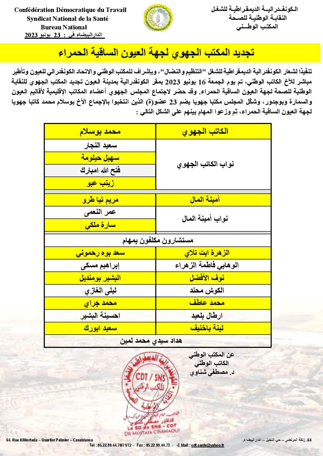 تنفيذا لشعار الكونفدرالية الديمقراطية للشغل “التنظيم والنضال ” ، وبإشراف للمكتب الوطني والاتحاد الكونفدرالي للعيون وتأطير مباشر للأخ الكاتب الوطني، تم يوم الجمعة 16 يونيو 2023 بمقر الكونفدرالية بمدينة العيون تجديد المكتب الجهوي للنقابة الوطنية للصحة لجهة العيون الساقية الحمراء. وقد حضر الاجتماع المجلس الجهوي أعضاء المكاتب الإقليمية لأقاليم العيون والسمارة وبوجدور، وشكل المجلس مكتبا جهويا يضم 23 عضو (ة) الذين انتخبوا بالإجماع الأخ بوسلام محمد كاتبا جهويا لجهة العيون الساقية الحمراء، ثم وزعوا المهام بينهم على الشكل التالي :