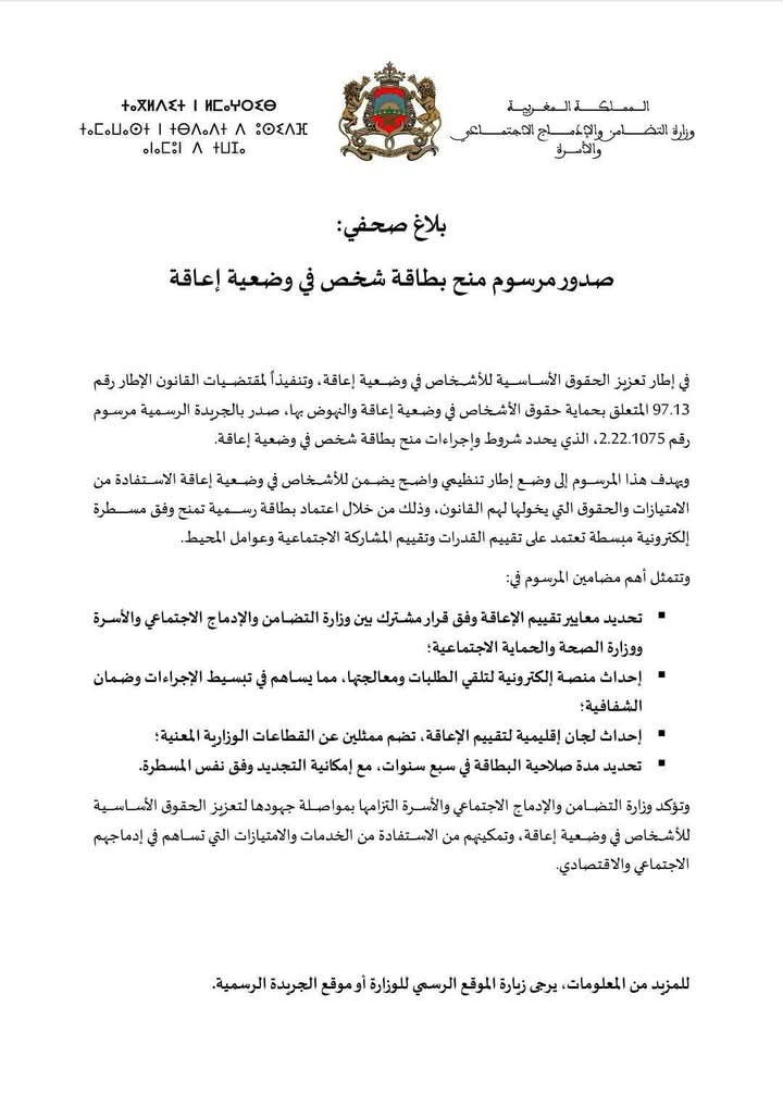 في إطار تعزيز الحقوق الأساسية للأشخاص في وضعية إعاقة، وتماشيا مع مقتضيات القانون الإطار رقم 97.13 المتعلق بحقوق الأشخاص في وضعية إعاقة والنهوض بها، أعلنت الحكومة المغربية عن صدور المرسوم الرسمي رقم 2.22.1075، الذي يحدد شروط وإجراءات منح بطاقة شخص في وضعية إعاقة.