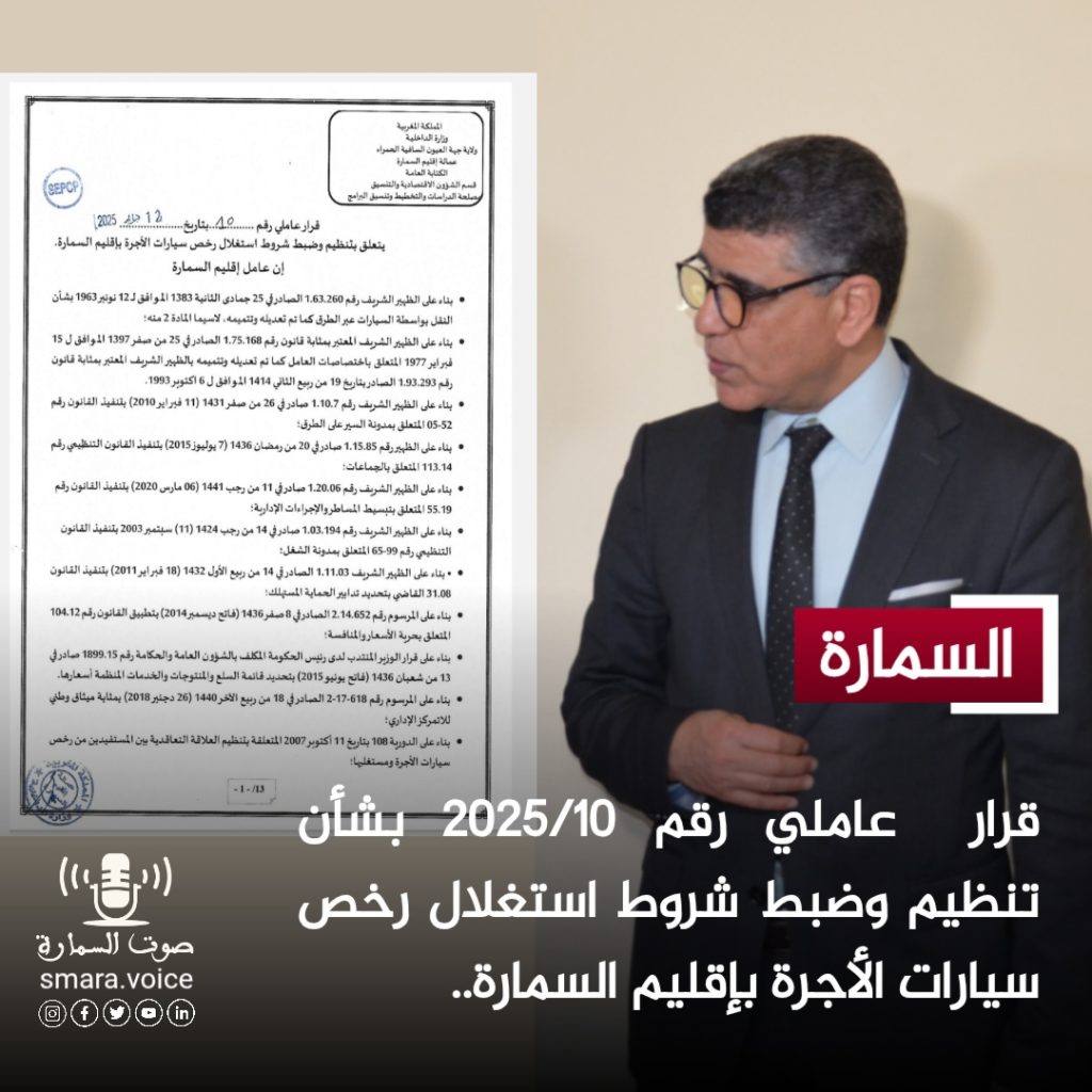 في إطار تعزيز التنظيم الإداري وتحسين جودة خدمات النقل العام، أصدرت عمالة إقليم السمارة بتاريخ 12 فبراير 2025، القرار العاملي رقم 2025/10 الذي يهدف إلى تنظيم وضبط شروط استغلال رخص سيارات الأجرة داخل الإقليم. يأتي هذا القرار استجابة للتحديات التي تواجه قطاع النقل العام وخاصة فيما يتعلق بسيارات الأجرة، وذلك لضمان تقديم خدمات ذات جودة عالية للمواطنين مع الحفاظ على حقوق السائقين والمستغلين.