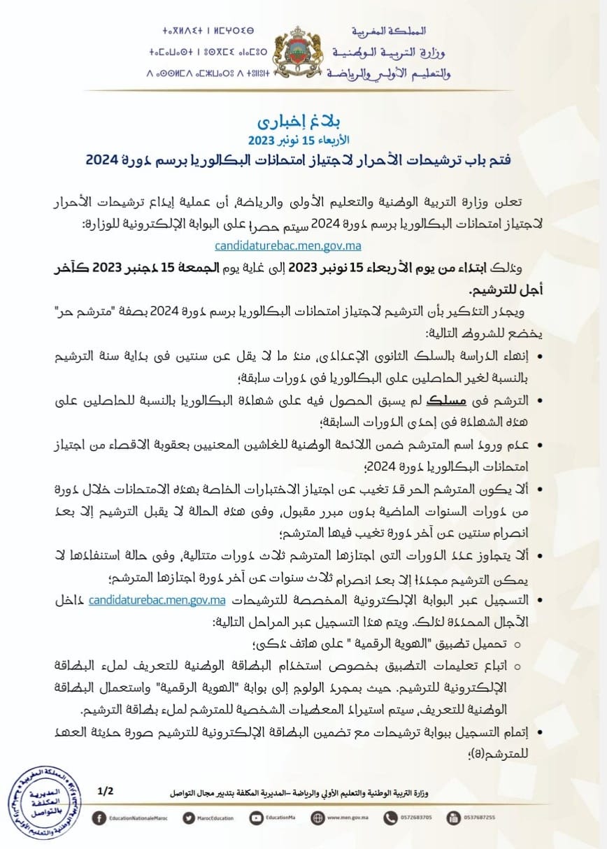 اعلان هام للمترشحين الأحرار.. فتح باب ترشيحات الأحرار لاجتياز امتحانات الباكلوريا برسم دورة 2024 الأخبار آخر تحديث نوفمبر 16, 2023 شارك شارك