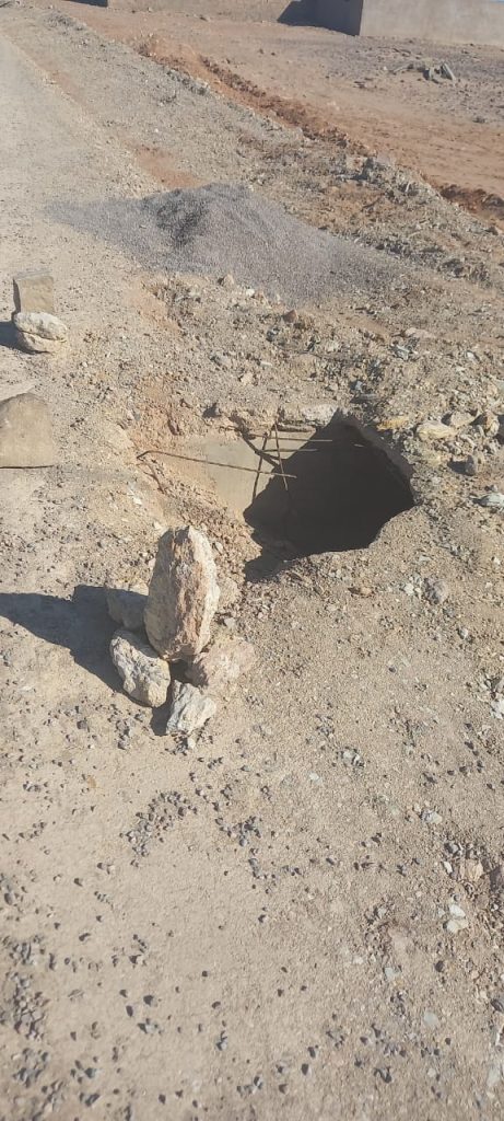 وتظهر في الصور بالوعة محاطة ببعض الأحجار التي وضعت على ما يبدو كإشارة تحذيرية، إلا أن ذلك يبقى غير كاف لتفادي الحوادث المحتملة خاصة في الليل أو عند ضعف الرؤية.