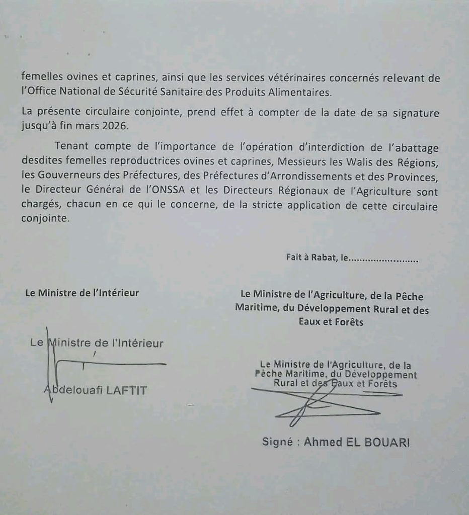 وسيتم تطبيق هذا التعميم المشترك اعتبارا من تاريخ توقيعه وحتى نهاية مارس 2026. وقد تم تكليف الولاة والعمال ومديري الفلاحة الجهويين والإقليميين بضمان التنفيذ الدقيق لهذا القرار.