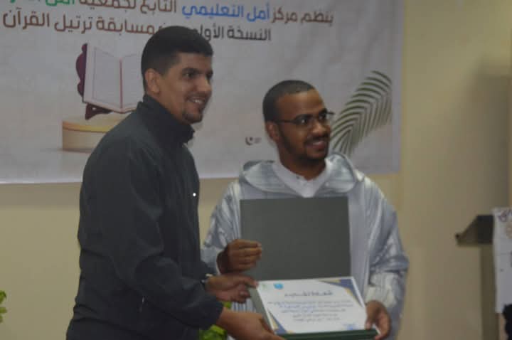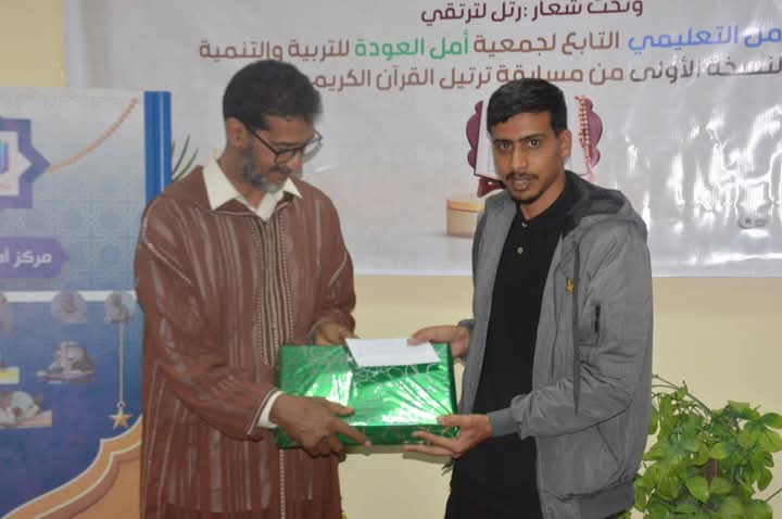 🥉تكريم الحاصل على المرتبة الثالثة المشارك “محمود الرگيبي” تسلمته الأستاذة مريم الوقاش بالنيابة عنه من يد القيدوم محمد إيكن.