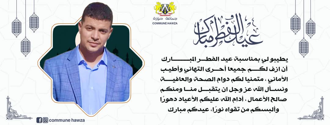 بمناسبة حلول عيد الفطر المبارك ، يتقدم السيد سيدي علال بوسعيد رئيس الجماعة الترابية حوزة ،أصالة عن نفسه ونيابة عن وأعضاء وأطر وموظفى الجماعة، بأحر التهاني وأصدق الأماني .