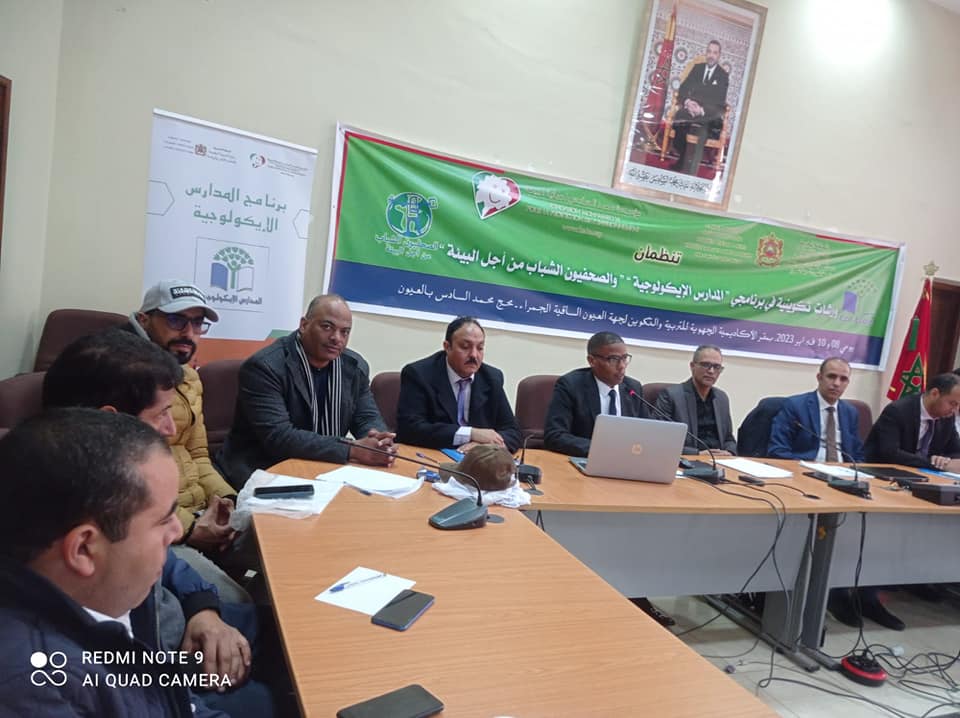 تفعيلا لبرامج التربية البيئية المشتركة بين مؤسسة محمد السادس لحماية البيئة ووزارة التربية الوطنية والتعليم الأولي والرياضة وتتفيذا للمخطط الجهوي البيئي الهادف إلى ترسيخ التربية على قيم المواطنة البيئية وتأطير وتابع ومواكبة البرامج الدولية والوطنية والجهوية والاقليمية في ارتباط وثيق بالأهداف 17 للتنمية المستدامة نظمت الأكاديمية الجهوية للتربية والتكوين لجهة العيون الساقية الحمراء الورشة التكوينية الجهوية حول الصحفيين الشباب من أجل البيئة بمقر الأكاديمية بحضور ممثل مؤسسة محمد السادس لحماية البيئة والسيد ممثل الوزارة وخبراء في البيئة والسيد المنسق الاقليمي للبيئة والتنمية المستدامة رئيس مكتب الحياة المدرسية والسيد رئيس مكتب التعليم الخصوصي بالمديرية الإقليمية السمارة والسيدة والسادة منسقي البيئة وتلاميذ المؤسسات التعليمية المشاركة وفي ختام الورشة تم توزيع شواهد تقديرية على المشاركين.
