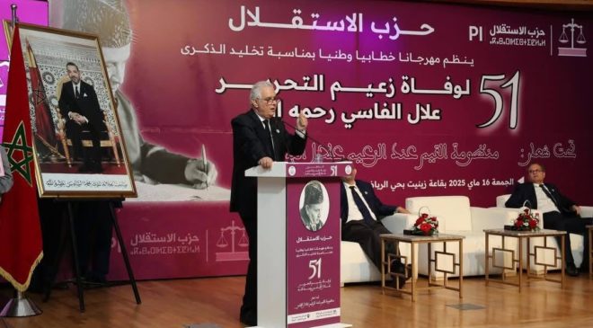 احتفاءً بالذكرى الواحدة والخمسين لوفاة زعيم التحرير والمفكر الوطني علال الفاسي، نظم حزب الاستقلال يوم الجمعة 16 ماي 2025 بمدينة الرباط، مهرجانا خطابيا وطنيا تحت شعار: “منظومة القيم عند الزعيم علال الفاسي”، وذلك برئاسة الأمين العام للحزب نزار بركة.
