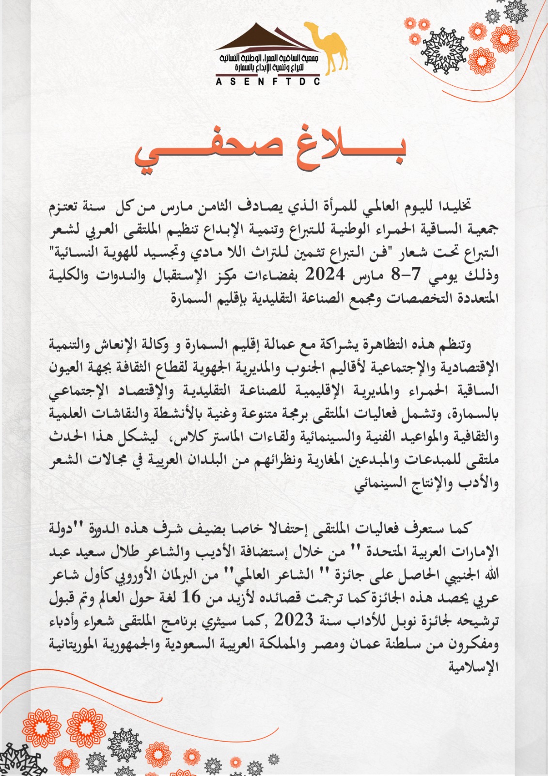 تخليدا لليوم العالمي للمرأة الذي يصادف الثامن مارس من كل سنة تعتزم “جمعية الساقية الحمراء الوطنية للتبراع و تنمية الإبداع” تنظيم الملتقى العربي لشعر التبراع تحت شـــعار “فن التبراع تثمين للتراث اللآ مادي و تجسيد للهوية النسائية” و ذلك يومي 7-8 مارس 2024 بفضاءات مركز الإستقبال و الندوات و الكلية المتعددة التخصصات و مجمع الصناعة التقليدية بإقليم السمارة ..