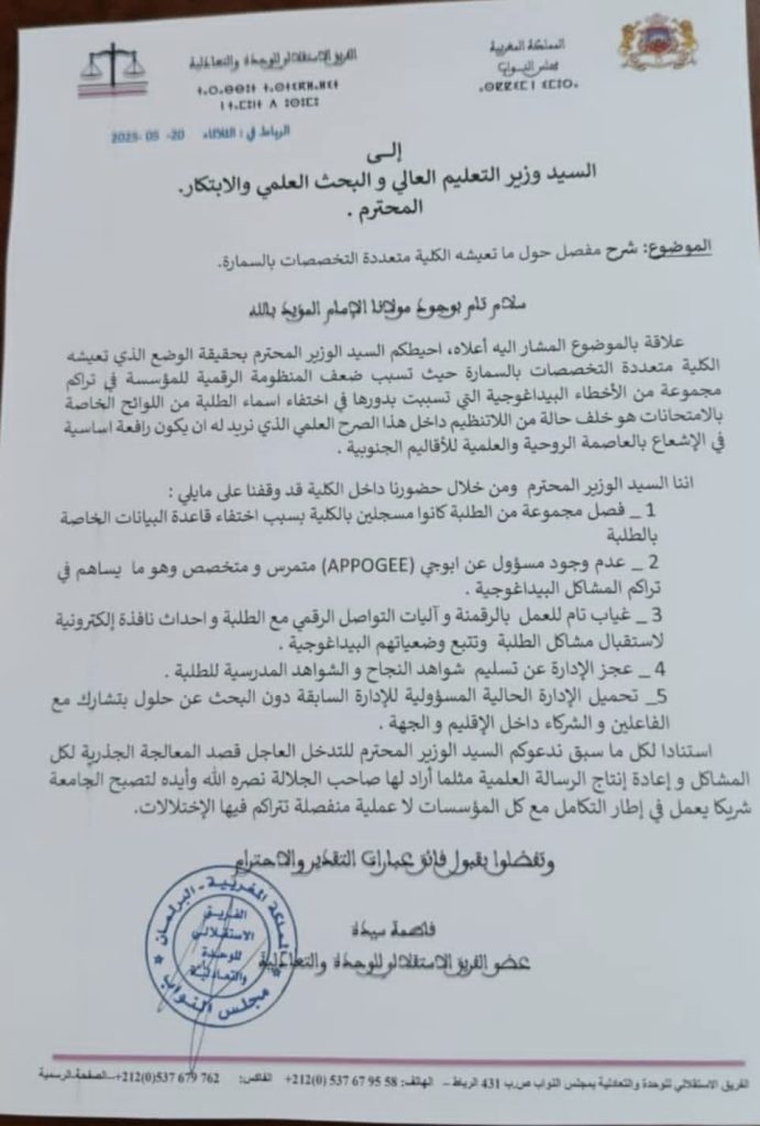 وجاء في المراسلة أن “ضعف المنظومة الرقمية للمؤسسة وتراكم الأخطاء البيداغوجية، إلى جانب غياب المسؤولية الإدارية، أدى إلى معاناة متزايدة للطلبة”، مشيرة إلى أن هذه الملاحظات تمت خلال زيارة ميدانية للكلية والاطلاع المباشر على أوضاعها.
