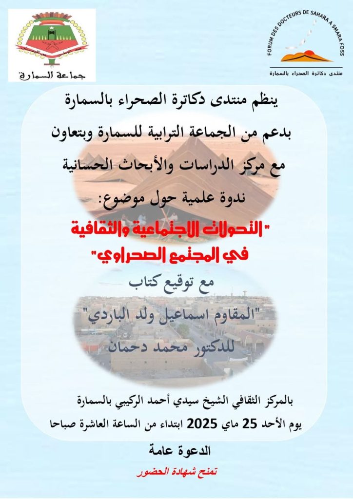 ينظم منتدى دكاترة الصحراء بالسمارة يوم الأحد 25 ماي 2025 ندوة علمية تحت عنوان: “التحولات الاجتماعية والثقافية في المجتمع الصحراوي” وذلك بدعم من الجماعة الترابية للسمارة، وبتعاون مع مركز الدراسات والأبحاث الحسانية بالمركز الثقافي الشيخ سيدي أحمد الركيبي.