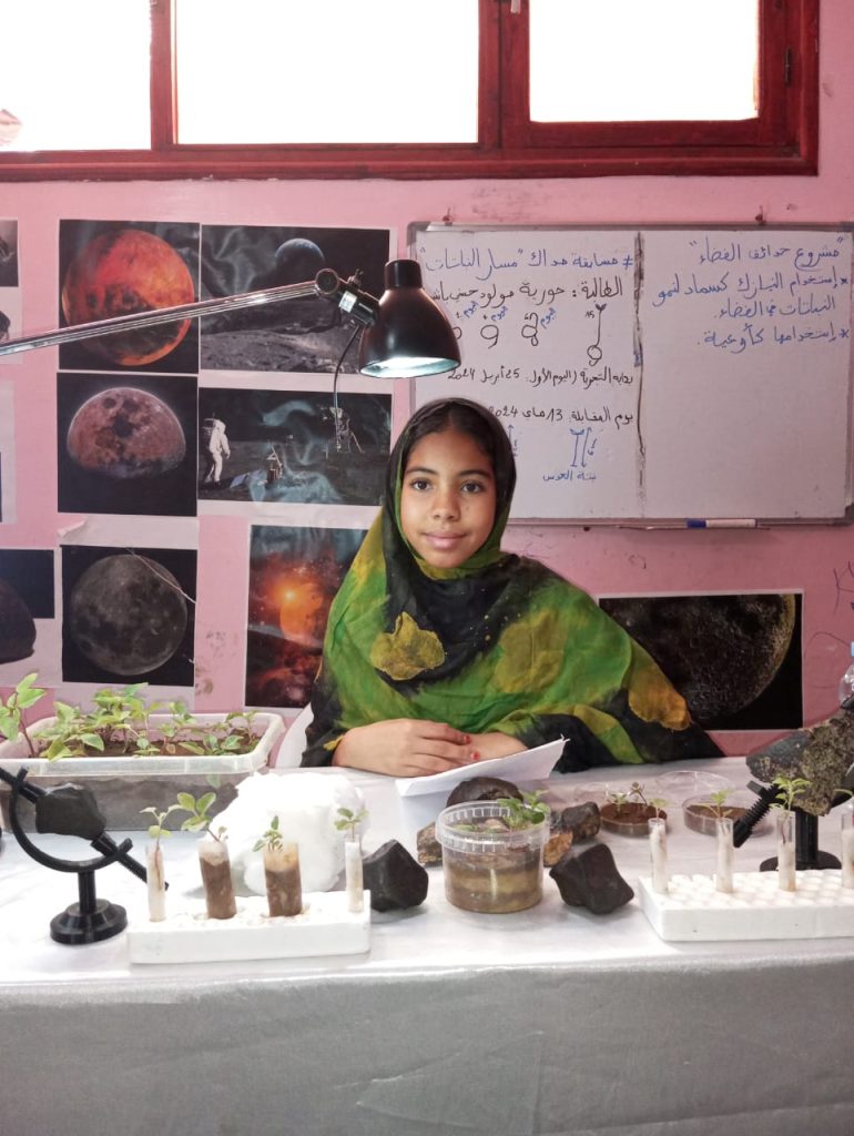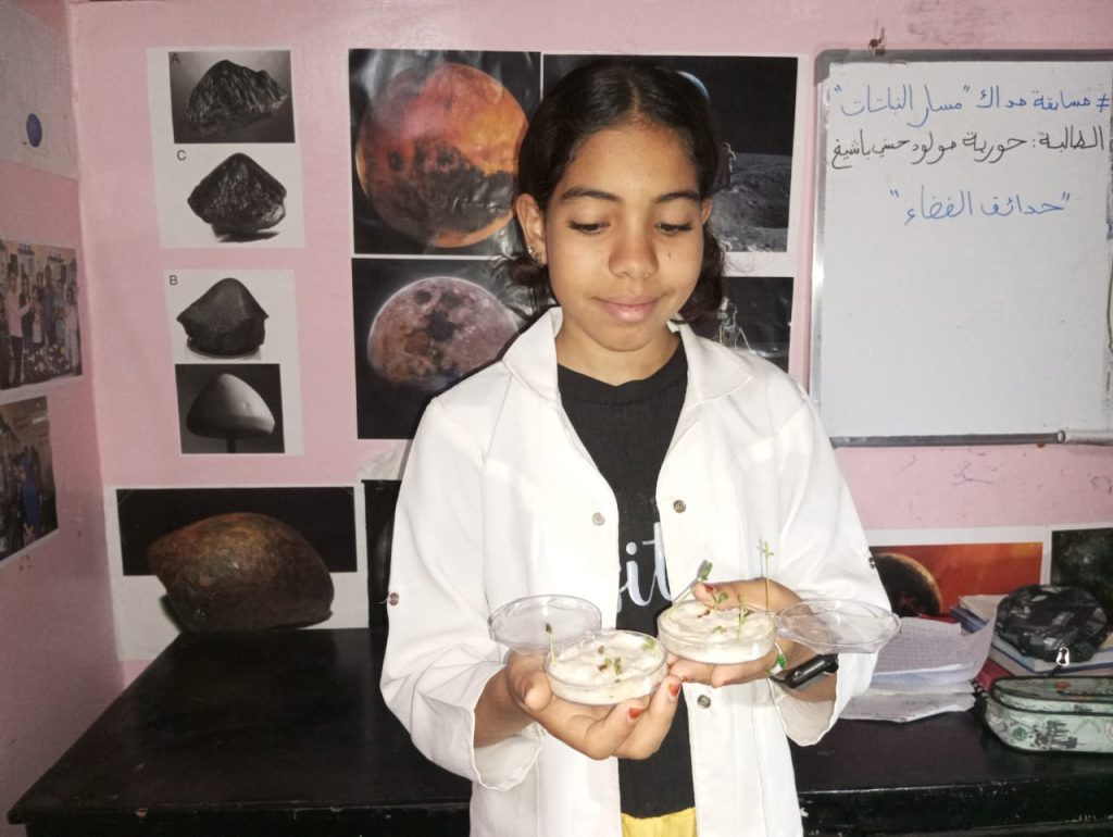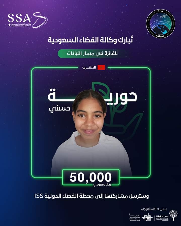 تمثّل حورية، التي تتابع دراستها بالجدع المشترك العلمي بمدينة السمارة، المملكة المغربية في هذه التظاهرة العلمية الدولية، بفضل مشروعها الابتكاري المتعلق بـزراعة النباتات في الفضاء، الذي يهدف إلى توفير حلول مستدامة لتغذية رواد الفضاء في بيئة تنعدم فيها الجاذبية.