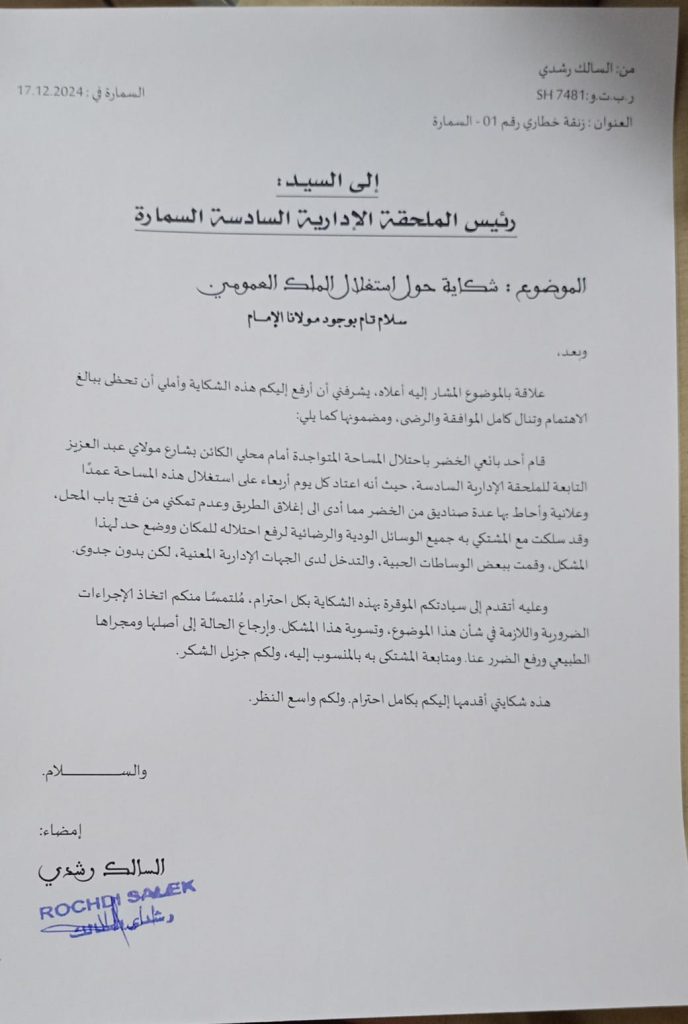 لا تزال معاناة أسرة الراحل السالك ولد اللا رشدي، بشارع مولاي عبد العزيز بالسمارة، مستمرة مع ما وصفوه بـ”التسيب في استغلال الملك العمومي” وذلك بعد أن كان والدهم – رحمه الله – قد وجه شكاية رسمية بتاريخ 17 دجنبر 2024 إلى رئيس الملحقة الإدارية السادسة، اشتكى فيها من قيام أحد باعة الخضر باحتلال المساحة المتواجدة أمام محله التجاري.