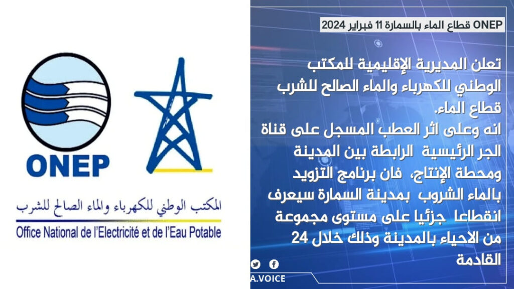 أعلنت المديرية الإقليمية للمكتب الوطني للكهرباء والماء الصالح للشرب – قطاع الماء، أنه على إثر عطب طارئ طال قناة الجر الرئيسية التي تربط مدينة السمارة بمحطة الإنتاج، فإن تزويد بعض أحياء المدينة بالماء الشروب سيعرف انقطاعا جزئيا خلال الساعات الأربع والعشرين القادمة.