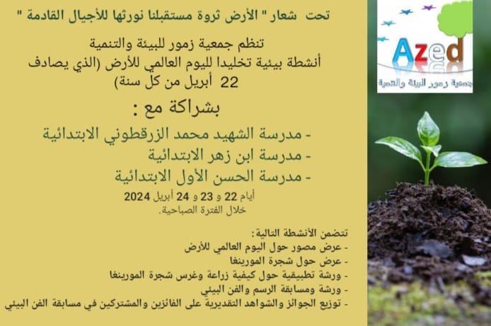 تحت شعار “الأرض ثروة مستقبلنا نورثها للأجيال القادمة”، تنظم جمعية زمور للبيئة والتنمية سلسلة من الأنشطة البيئية احتفالاً باليوم العالمي للأرض الذي يصادف 22 أبريل من كل سنة. ستجري هذه الفعاليات بالشراكة مع مجموعة من المؤسسات التعليمية خلال الأيام 22 و23 و24 أبريل. وسيتضمن البرنامج فقرة تعريفية بالجمعية ومجالات اشتغالها، بالإضافة إلى تقديم نظرة شاملة عن أنشطتها منذ تأسيسها في أواخر سنة 2012 وحتى اليوم.
