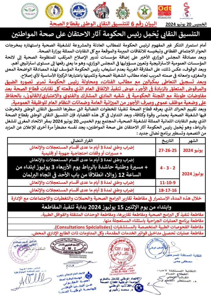 التنسيق النقابي الوطني بقطاع الصحة يقرر مواصلة اضرابه حسب البرنامج المسطر.. الأخبارصـحـة آخر تحديث يونيو 24, 2025 شارك شارك
